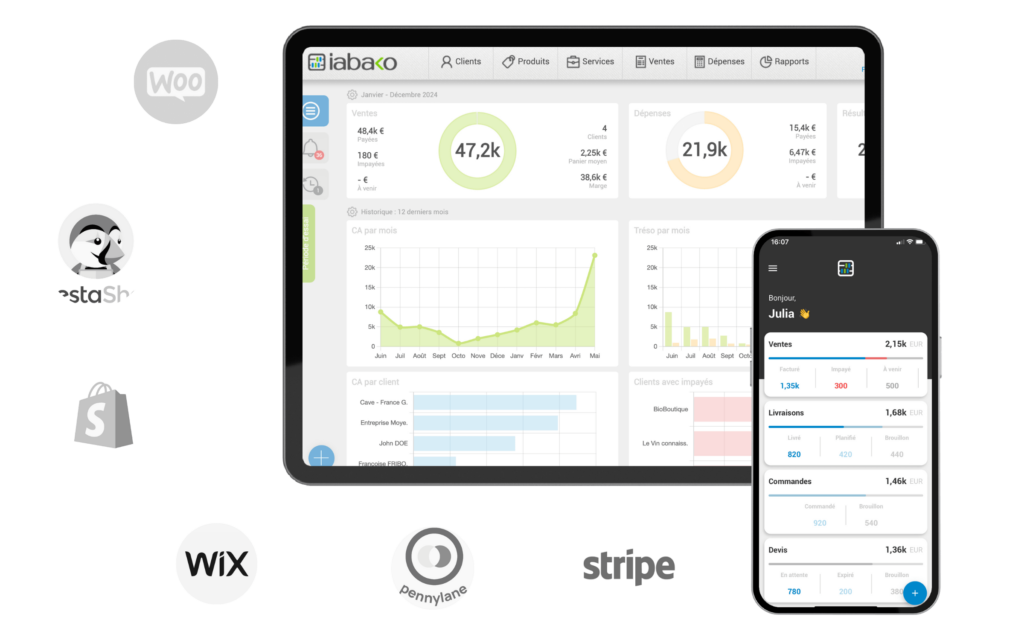 Centralisez votre gestion dans un seul outil. Connectez votre e-commerce à IABAKO, importez vos ventes en ligne, synchronisez les stocks et facturation. Suivez vos Commandes, Livraisons, facturez simplement.